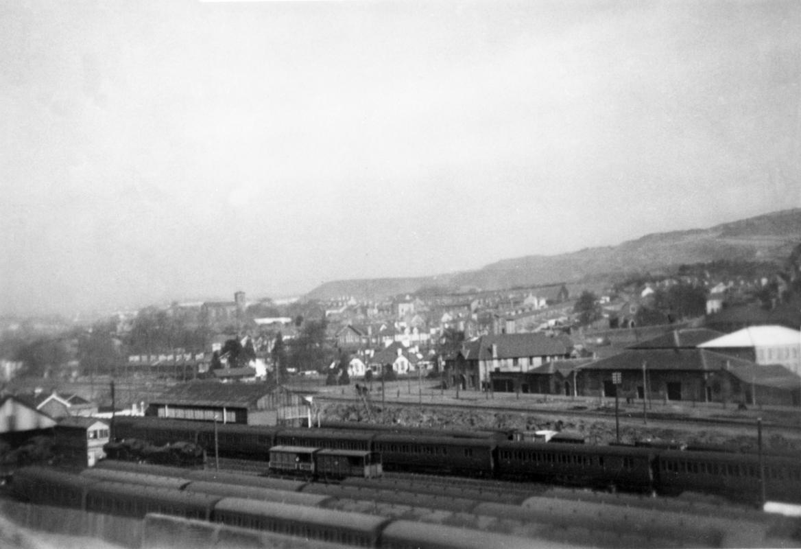 Black and white photograph Clywedog Dam: Dam site viewed from Downstream