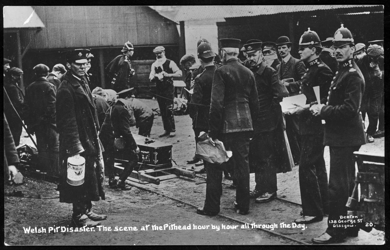 Photograph "Pit Disaster at Senghenydd. "Heroes All". A rescue party leaving the Pit after a night search". Rescue teams were used at Senghenydd for many days, searching for survivors and fighting fires which were raging underground. One of the teams is shown leaving the pit after their shift.