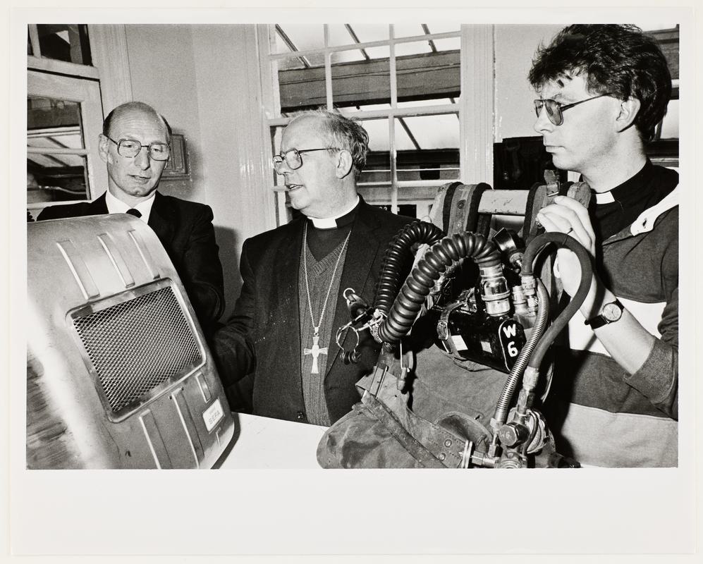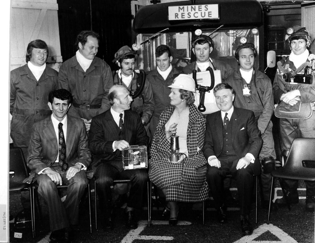 Brigade men, from Dinas Rescue Station, in Draegar breathing apparatus, practising in model underground gallery, simulating an exploring party climbing over fallen roofing. They are carrying electric inspection lamps. Instructor on left. Man second from left is testing the roof for danger spots with a mandrel helve.