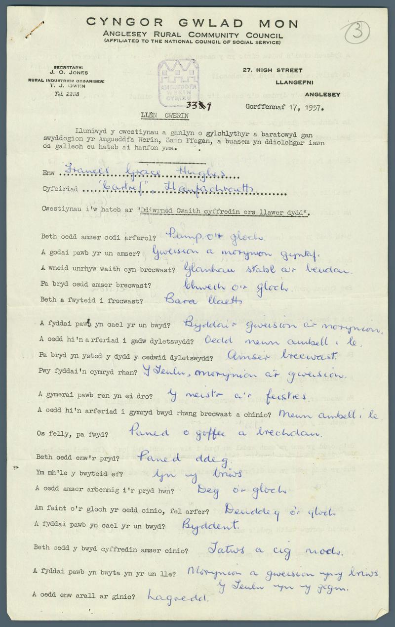 Responses to a 1957 questionnaire created by the Welsh Folk Museum and distributed by Anglesey Rural Community Council. Completed by Cledwyn Hughes, Rhosneigr, Anglesey, on the subject area of 'a typical work day in year's gone by'. The questions were prepared by the Welsh Folk Museum in 1957 as a way of collecting and documenting information on the ‘common working day’. The questionnaire was distributed by Anglesey Rural Community Council. The questions have been typed and the responses have been hand-written.