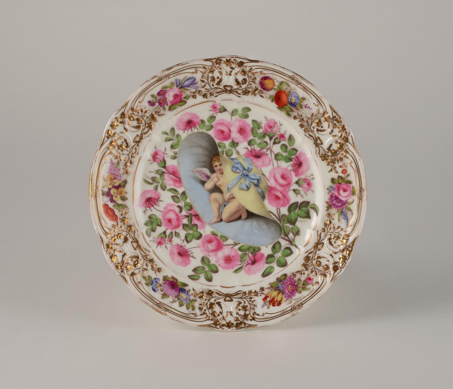 Plate, soft-paste porcelain, clear white translucency, lustrous glaze with grit specks on the upper surface at 6 and 10 o clock, the rim moulded in six small and six large lobes; decorated with a gilt line round the foot ring, the rim gilt, with a narrow white line between an inner band of tooled tongue and shell gilding, uneven enamelled blue ground to the cavetto painted in yellow ochre with, at the top, foliate scrolls issuing from a patera and, at the bottom, similar scrolls flanking an urn, the centre reserved with an oval containing a 3/4 length Bacchic figure of Comus, turning to right, a staff on his shoulder and head wreathed vine, dressed in a leopard skin and purple cloak, holding out a glass and metal goblet of red wine to a seated female figure in conventional Regency dress, comprising a white gown, violet overgarment, and red cloak, trees in a landscape behind.