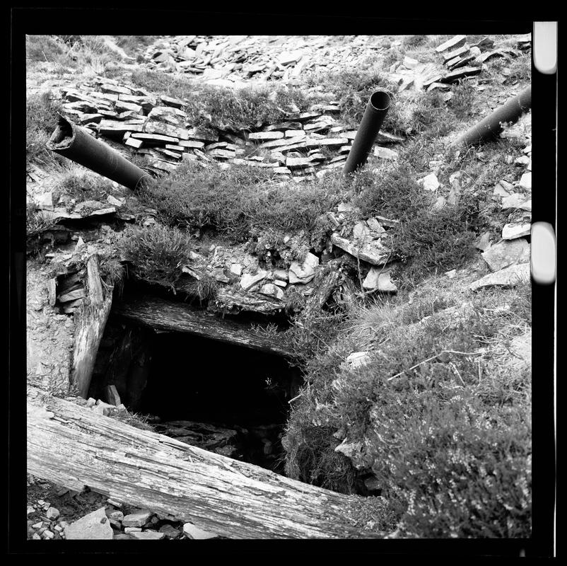 Black and white film negative showing men beside a conveyor, Celynen North Colliery 1978-9. 'Celynen North 1978-9' is transcribed from original negative bag.