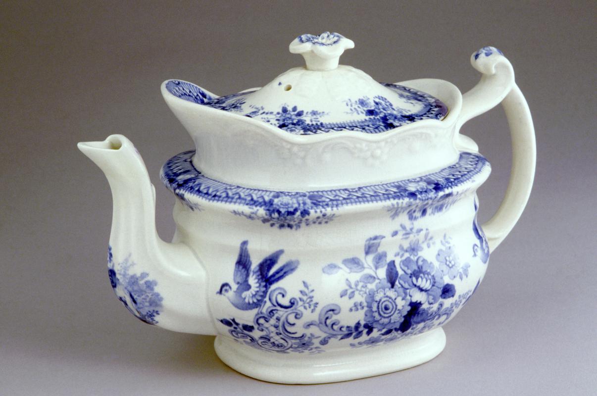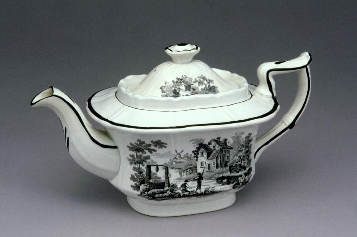 Cow-creamer and cover ,earthenware, in the shape of a cow, standing on a rounded oblong base, moulded around the edges to resemble foliage, the cow, with cloven hooves, an udder with four teats, a realistically modelled body with prominent breast bone, two curved horns above the ears, the spout formed by the animal's open mouth, the handle formed by the tail looped over the cow's back, the tip of one horn broken off and the other horn broken off completely, the cover, ovoid, forming part of the backbone, and with a large chip missing from it; transfer printed in black with to one side of the body a rustic scene showing three figures in a boat on a river with a hammock slung on a patch of ground to one side of them and in the background buildings, trees and a dove-house on a high post, to the other side of the body another rustic scene showing two figures fishing in a river with a well to one side and in the background a large building, trees and a distant windmill, to the base of the cow-creamer a smaller rustic scene showing a cottage and trees, a similar scene of a cottage to the cover, the horns, mouth, and hooves all painted in black, a black band around the edge of the base.