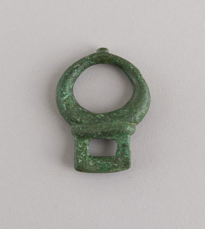 Small gilded rectangular object with central raised area (enamelled?) and incised lines in possible chevron pattern on surface. Possible badge. Top end extends into perforated lug for attachment.