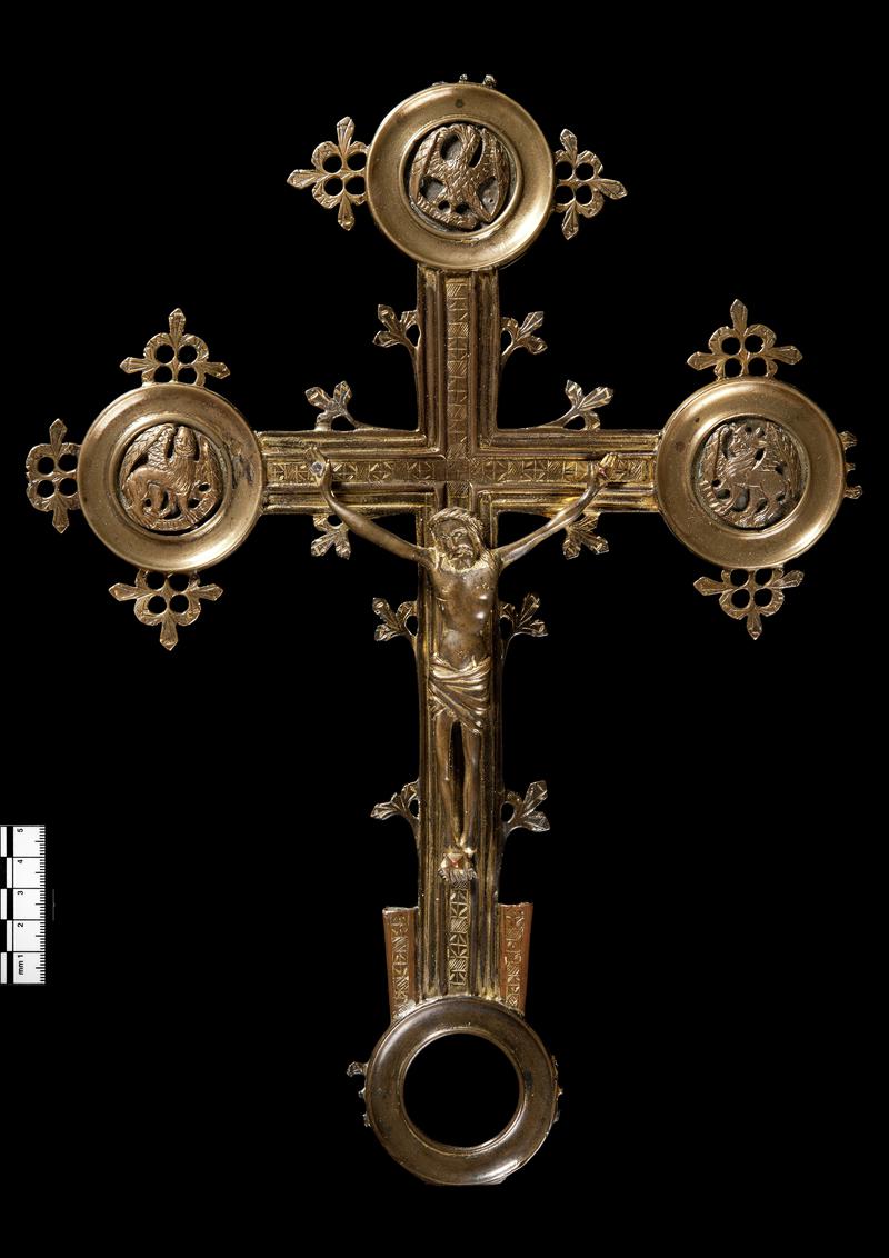 In the form of a recessed panel with a crucifix and figure of St. John attached (the figure of St. Mary is now missing), diapered background in recess and crested top. Made from two sheets of copper alloy joined together with figures attached by rivets. The lower portion of the cross from the central figure is missing, as is its left hand rivet. The upper of the applied borders is missing leaving two rivet holes. One fleur-de-lys, part of the left hand and all of the right hand corner decoration are missing from the upper border.