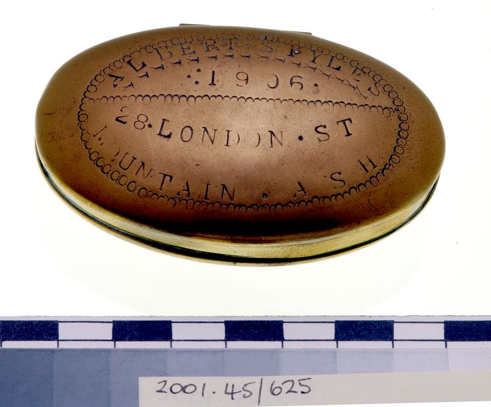 Oval brass twist box with hinged lid and owner details and flower design engraved in center. Star and half moon chain design along lid edge.