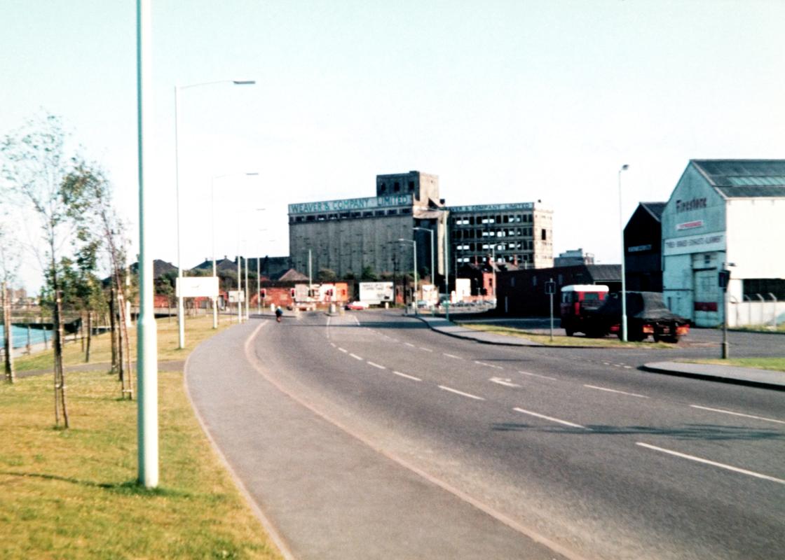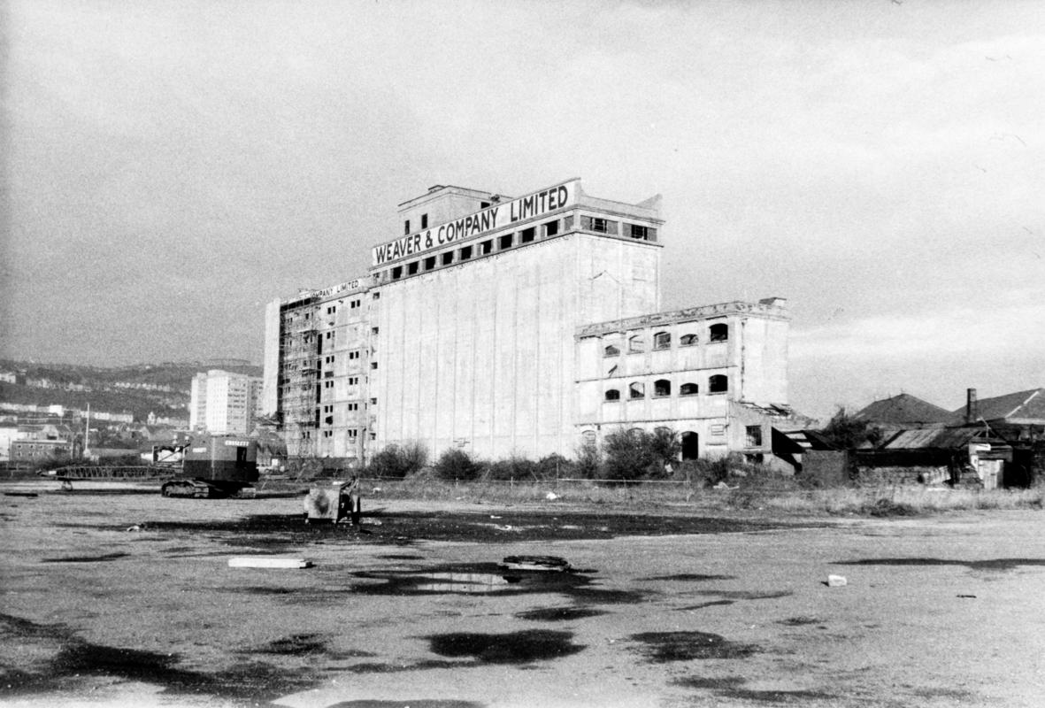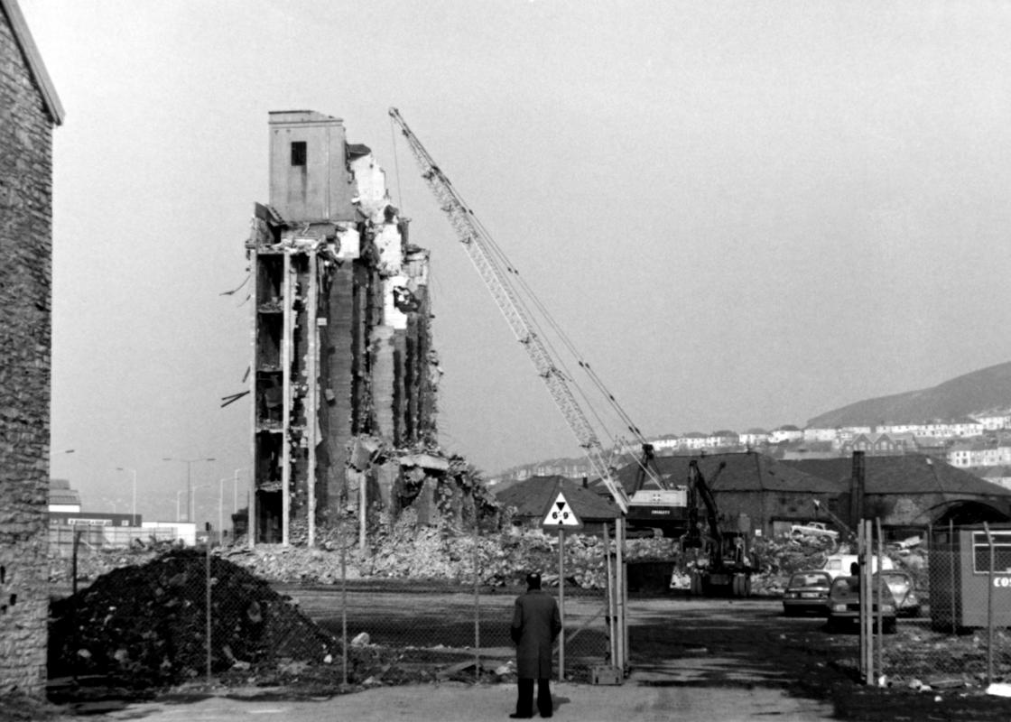 Colour photograph showing Weavers flour mill, Swansea, being demolished, 28 January 1984.