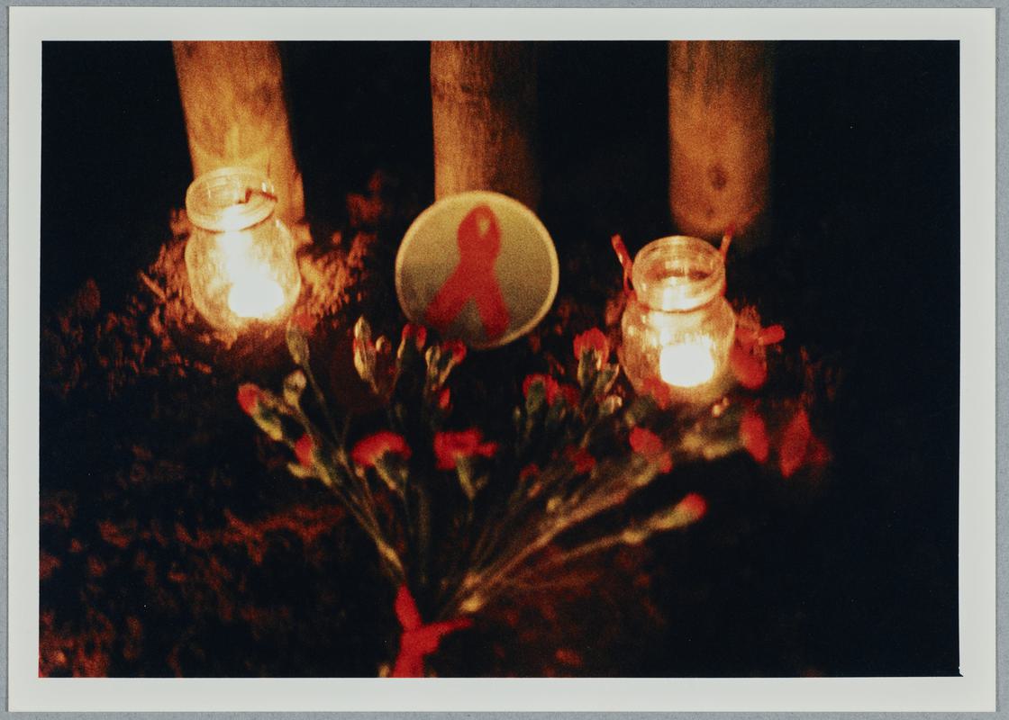 Made from woven synthetic tape (probably Nylon), with black plastic safety clip fastening and metal swivel hook on the other end. Ends are machine stitched using multi-colouredthread and raw edges are stopped from fraying by melting. One side of the tape is red with white lettering and the other side is rainbow coloured with white lettering.
