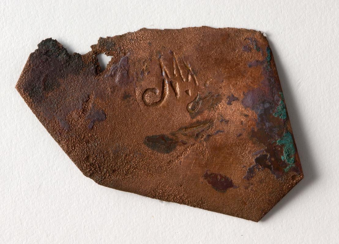 Lead ingot recovered from the sea off North Wales. One of 50 pigs recovered from wreck of sloop LOVELY, wrecked in 1808 at Maen Mellt, 8 miles north east of Bardsey Island, enroute from the Holywell area or Deeside. The inscription 'E' may refer to Adam Eyrton of Holywell, a smelteand refiner of lead. The lead has a silver content of 0.04% equivalent to 14 tray ozs per ton which is normal for Flintshire lead ore (see Maritime Wales No 1 1976 pp 51-62).