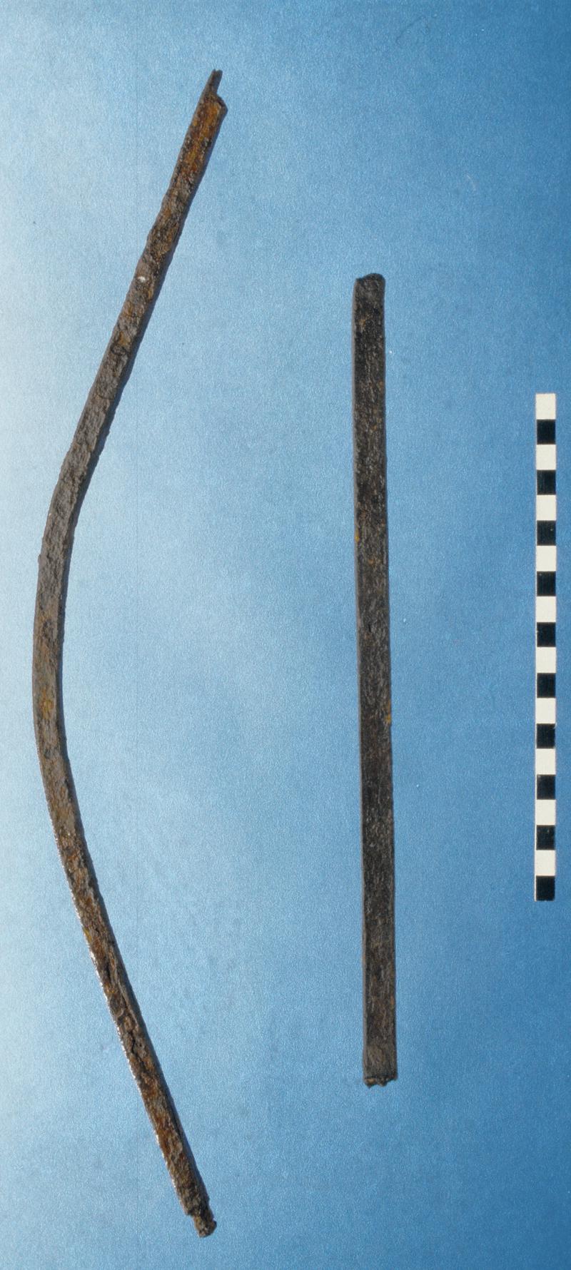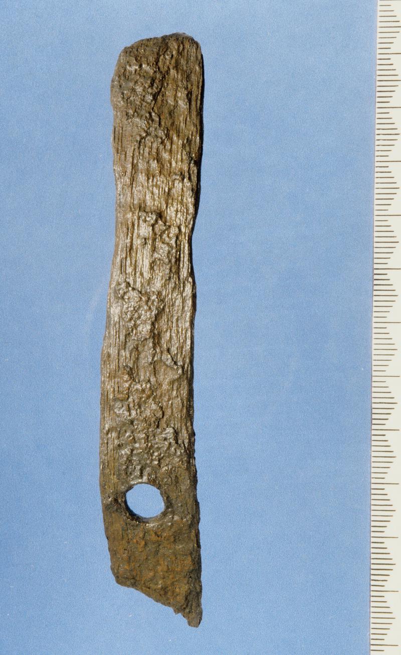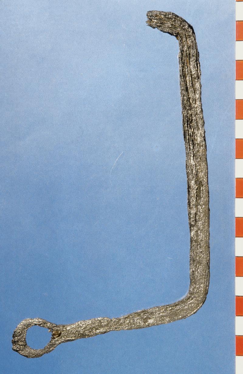 Fitting, of iron: a circular-sectioned bar, expands at one end into a spoon-like in breadth which itself terminates in a revetted foot, probably incomplete. There is a broken iron rivet in the hollow of the 'spoon'. Purpose unknown.