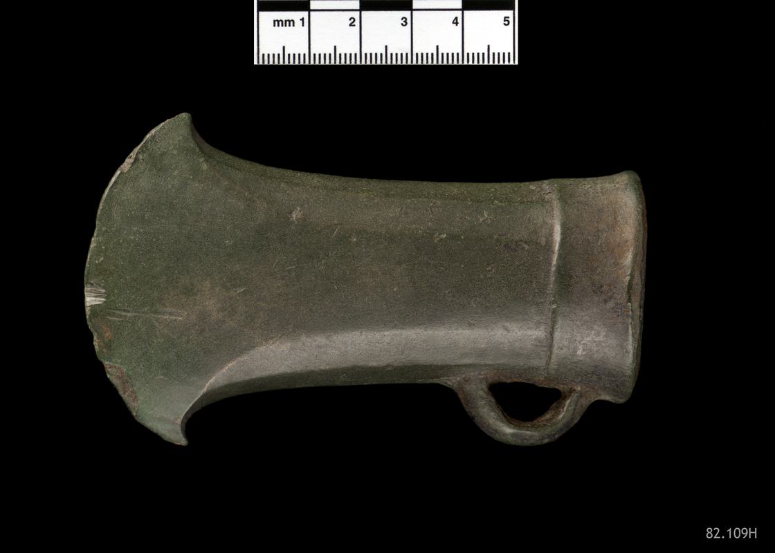 Blade end fragment of ribbed socketed axe, which has been struck with an implement near the break, as evidenced by a squashed socket base and by splaying sides. Two ribs visible on one surface, however these are located on left hand side and centre of axe surface, suggesting existence of possible further rib on right hand side, perhaps shorter in length, and therefore not visible on this blade end fragment. Axe originally had slightly divergent concave shaped sides, widening to form a cutting edge with no recurving of sides. Curtting edge moderately convex in shape. Casting mark visible down one side of blade but worked down. Base of socket evenly shaped. Cutting edge corroded, with evidence of striations along blade bevel, parallel to the blade edge, indicating sharpening. Green patina with lighter green carbonate encrustations.