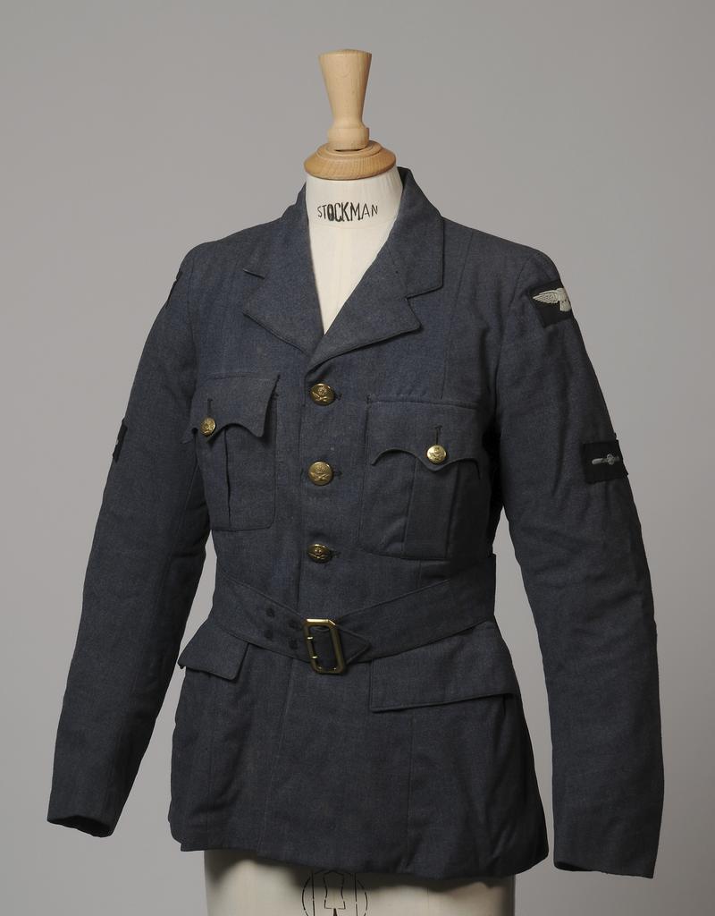 Blue/grey wool twill weave fabric with a navy tablet woven wide braid around the base. The back of the cap has a turn up of the fabric, while the front has a shaped leather peak (two different types of leather used, one type pigmented black on the upper side, one pigmented green on the lower side). A patent leather band with metal buckle details sits across the top of the peak, held in place with two buttons. A copper alloy King's crown RAF badge sits at the front of the cap centre. The cap is lined with a twill weave cotton, with a maker's label stitched at the proper right side lining. The crown of the cap lining has been coated with something, possibly paper based with animal glue (?) to secure it in place.