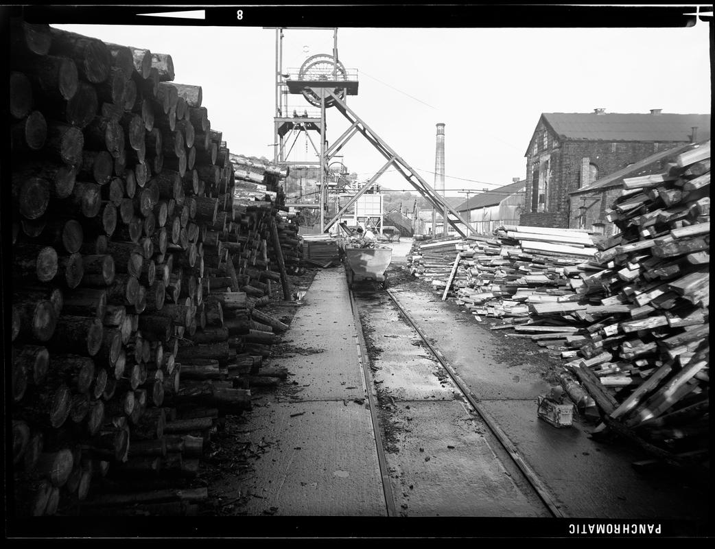 Colour film negative showing a view towards the downcast headframe, taken from Celynen North Colliery yard.