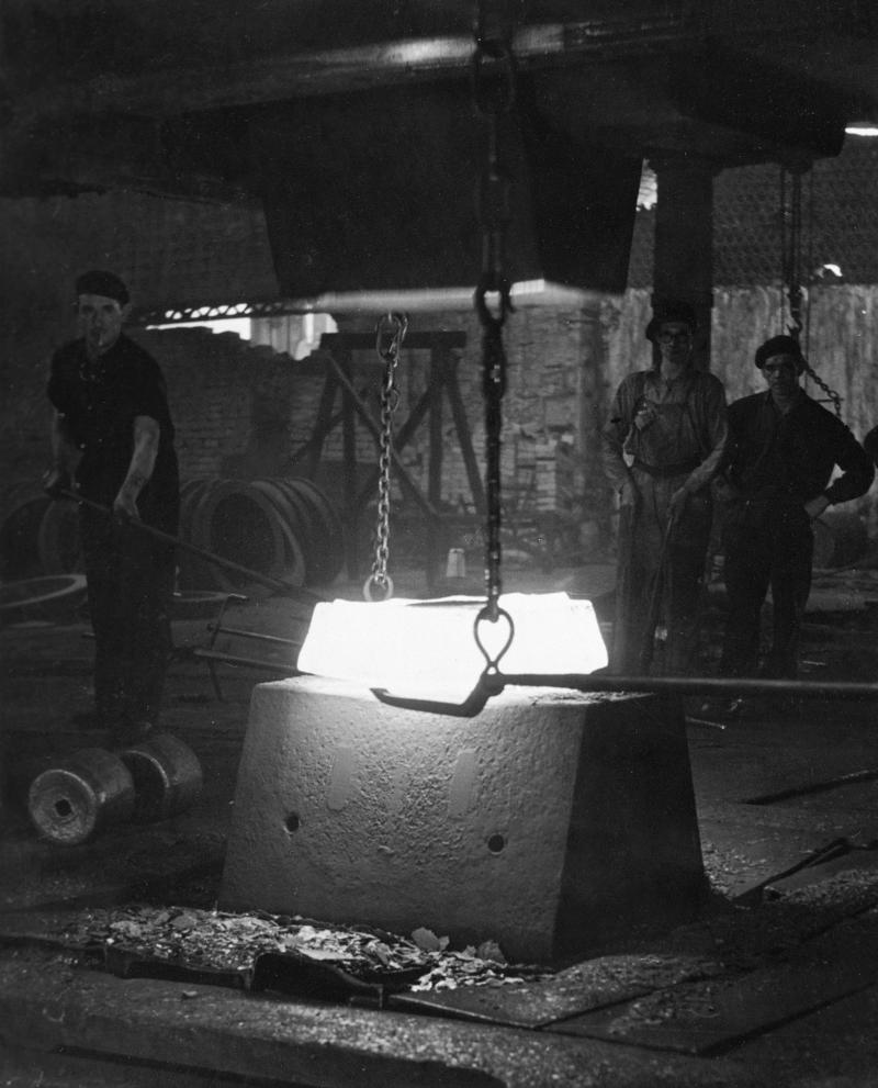 Manufacturing at Blaenavon Ironworks. View showing the parting of sawn ingots into discs using sledgehammer and a wedge to crack the central portion which saws could not reach. Print stuck on thin card with holes punched at left.