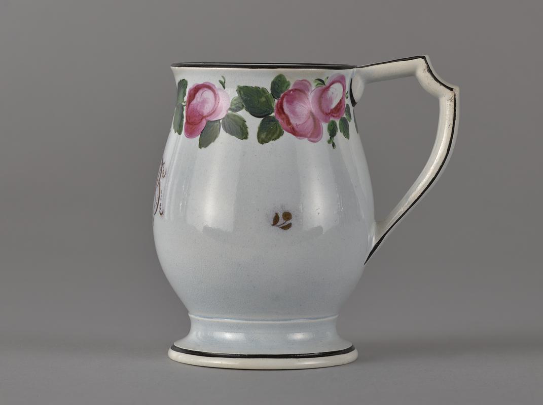 Pearlware mug, straight slightly tapering side; handle with moulded acanthus leaf spur and gilt decoration. Gilt bands to upper and lower rims, gilt border around upper rim of overlapping pointed ovals, each with three dots vertically arranged inside. Gilt relief shield on front, containing E monogram. Pale orange ground to rest of body, with decoration of varying sized circles in darker shades of orange. Underside of foot painted dark brown.