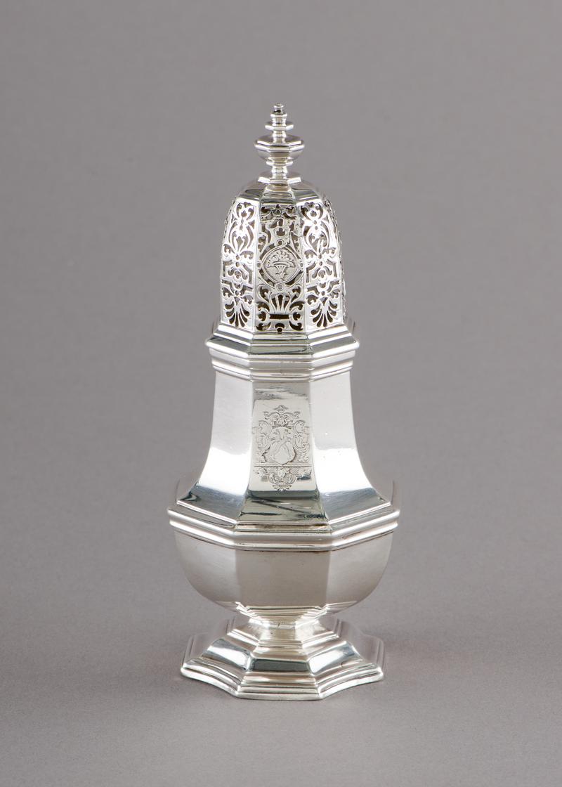 Centrepiece or surtout de table, comprising; an octagonal baluster basin or tureen on four prominent scrolling feet, the lower part decorated with Regence strap, feather, anthemion and acanthus ornament on a matted ground; each side cast with a panel of beaded trellis work applied in low relief with the arms of Williams, two foxes salient in saltire, the ends applied with boldly modelled female heads on a chased and punched diaper ground between shell and floriate scroll panels, two curving ribbed handles with leaf ornament and shell terminals, a cast band of Regence strap and mask ornament on a matted ground below the lip; a shallow octagonal dish, with fluted sides and reeded rim, four shell and leaf scroll handles, the centre engraved with the arms of Williams on a diaper ground in an elaborate scroll, shell and mask cartouche flanked a mer man and woman supporting a fountain on their heads; at each corner of the lip a square holder for four up-curving candle branches, comprising a spreading square section branch with leaf scroll ornament, a dish-shaped drip pan engraved with a fox head crest, and a baluster nossle; below on each corner of the lower part of the body a square holder for four small dishes on supports, the dishes or saucers circular with fluted sides and engraved with the arms of Williams as on the centre dish but reduced in size, on four hoof feet for separate use but screwing into curved supports with matted ground, folliate scroll ornament and central baluster; in the centre of each long side a support for a tripartite caster stand comprising a central octagonal plate for a large caster flanked by smaller similar, all three elaborately pierced and engraved with strapwork, the central one decorated with the Williams arms among medallion heads, shells and scrolls, the smaller similar and bearing the fox head crest; on each short side a cruet frame containing two cut-glass bottles (one a modern replacement), the frames slotting onto a curved folliate ornamented support on a square holder from the lower part of the body, each on four hoof feet for separate use and with an ear-shaped handle, each bottle container octagonal with pierced sides, elaborately engraved with strapwork, scrolls and masks, the long-necked facetted bottles fitted with silver mounts comprising a double C-scroll handle and a deep lip, with a small sparrow-beak spout and a domed, hinged cover and bead finial.