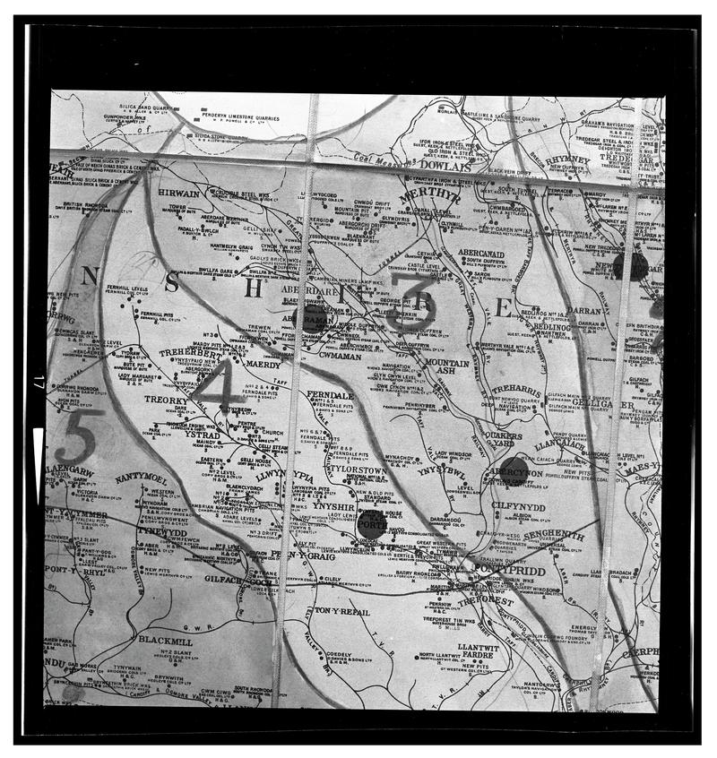 Black and white film negative showing Gordon's map of the south Wales coalfield (Carmarthenshire/Glamorganshire). 'Gordons Map' is transcribed from original negative bag.
