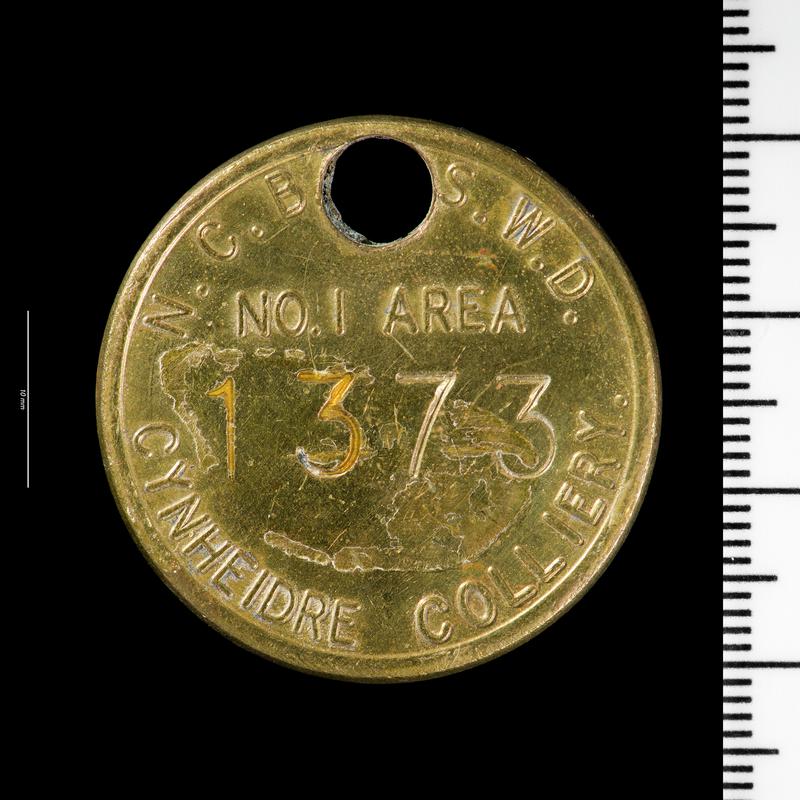 Circular lamp check with hole near edge. Embossed 'N.C.B. S.W.D. / No.1 AREA / CYNHEIDRE COLLIERY' and lamp number '1646' stamped in centre. On rear is stamped '2256' at centre.