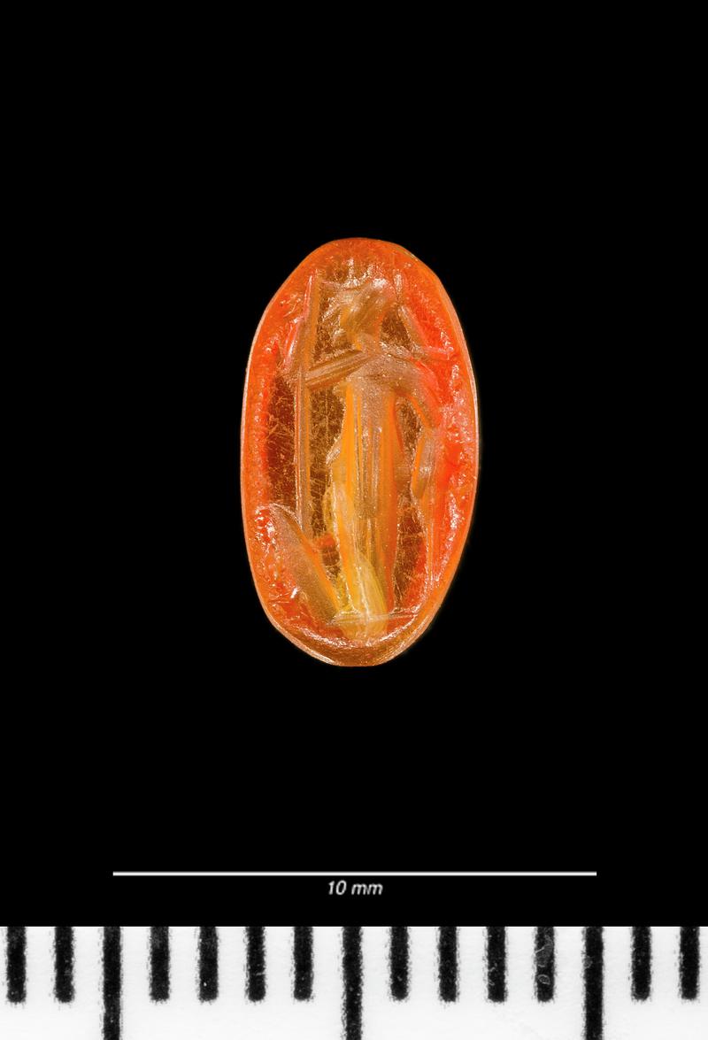 This is one of 88 engraved gemstones retrieved in 1979, mostly from the filling of a large drain beneath the cold hall of the fortress baths. The gemstones would originally have been set in finger-rings, and served as signets and charms or talismans for their owners. They were products of extremely skilled craftsman who worked on a minute scale without the aid of magnification. The gems are engraved with a wide range of deities, personification and symbols.