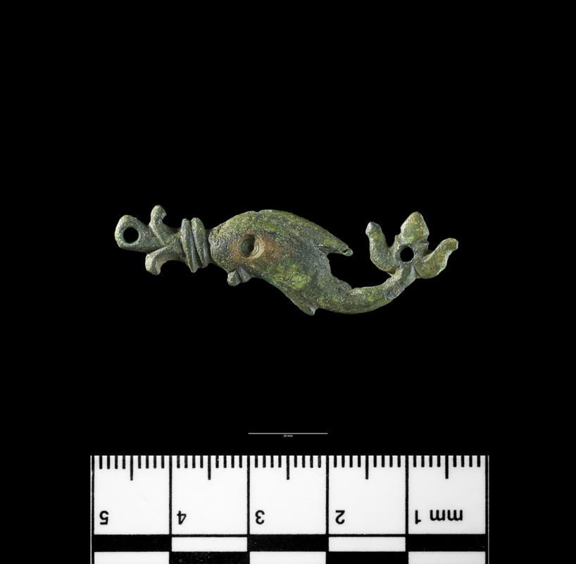 Roman copper alloy harness fitting: terret of 1st or 2nd century AD date The cast terret is of strap-mounted type and is complete (with an overall length of 53.2mm, a maximum width of 52.8mm, maximum internal dimensions of 37.4mm x 16mm and a weight of 53.0g). The basal loop is integral and sub-rectangular (21.5mm wide and 8.5mm deep with internal dimensions of 13.4mm x 4.2mm) and with a sub-rectangular to oval sectioned frame (5.5mm wide and 4mm thick). Above the loop there is an oval moulding (7.5mm long and 12.6mm wide) with a convex upper edge (7.4mm deep). Above the moulding, the hoop is flat and rectangular-sectioned but somewhat irregular in width and thickness (with a thickness of 2.7mm ā 5.9mm). The hoop is widest at its base (at 10mm) and gradually narrows towards its apex (to 5.5mm). On the interior of the hoop are decorative opposing āCā scrolls with a bifurcating tope edge. No applied decoration is evident on the terret. Areas of wear are discernible on the inside of the hoop, particularly to one side of the apex. The surface has a dark-green patina with some finishing striations evident beneath the patina.