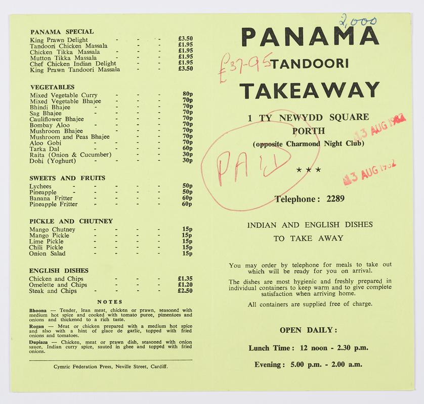 Bill for services at 'Dorville Hotel', Cardiff. Handwritten order details on the front. Stamped with date 21 November 1961.