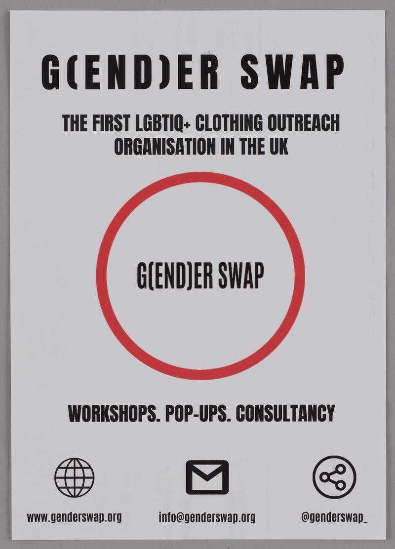 G(end)er Swap recalls "These two badge designs were made for our G(end)er Swap Self Care Series: a series of online workshops to support trans people with makeup, style and self-care resources during the pandemic. The series ran from February to June 2021 and was funded by Metro Charity and Comic Relief. The white badge with our slogan on it: Be Whoever, Wear Whatever was design by Meg (known as @megemiko on Instagram) who is a trans non binary artist based in the USA. They are known worldwide for their LGBTQ+ apparel designs and for raising money for various LGBTQ+ BAME charities. The designs started off for social media posting, later hoodie designs and finally badges. Lot’s of these badges were sent out in our self-care packages we sent out to trans people in 2021 when many folks still could not travel or attend physical community events".