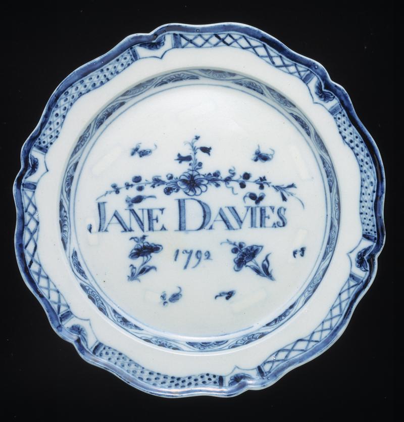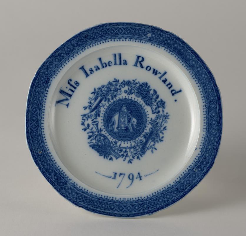 Jug, lightly potted creamy eathenware with a pearl glaze thinning in places, ovoid body, high straight neck, deep projecting spout, double C-scroll handle with large foliate thumb piece, wide raised centre band and foliate lower section with slight kicked-off terminal. Painted around the body in underglaze blue and in brown and green enamels with a continuous pastoral scene, comprising a man in a wide hat, open waistcoat, breeches and boots ploughing a field, the plough being drawn by two horses in blinkers; another smaller man with a wip, frockcoat and wide floppy hat in the background. Behind the ploughman is a green bank with two thatched cottages, trees and a boundary wall, a fence, and barred gate, with a path into the field. One cottage has a spire-like finial to its round windowed gable. Two more cottages, fences and a willow tree at the other end of the field and flocks of birds in the sky. Painted in brown on one side of the neck 'Iohn Jinken 1793'and on the other side with an elongated foliage spray. Triple banding of brown at the junction of the body and the neck, the rim decorated with an underglaze blue band of cross hatching above a freize of lunettes and florets, and the handle painted with a scroll of brown leaves.