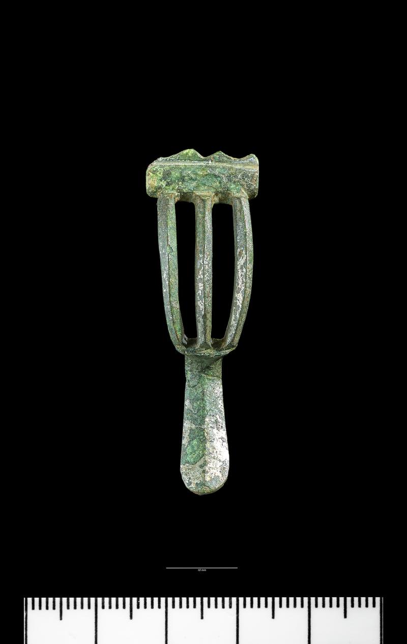Lower part of a bow brooch with small catch-plate. The outer face of the bow is decorated with an incised feather pattern. Probably a first-century type such as a Colchester derivative.