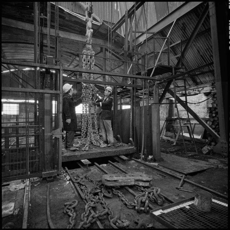 Colour film slide showing a group of men in the cage after a shift underground, Big Pit 1975.