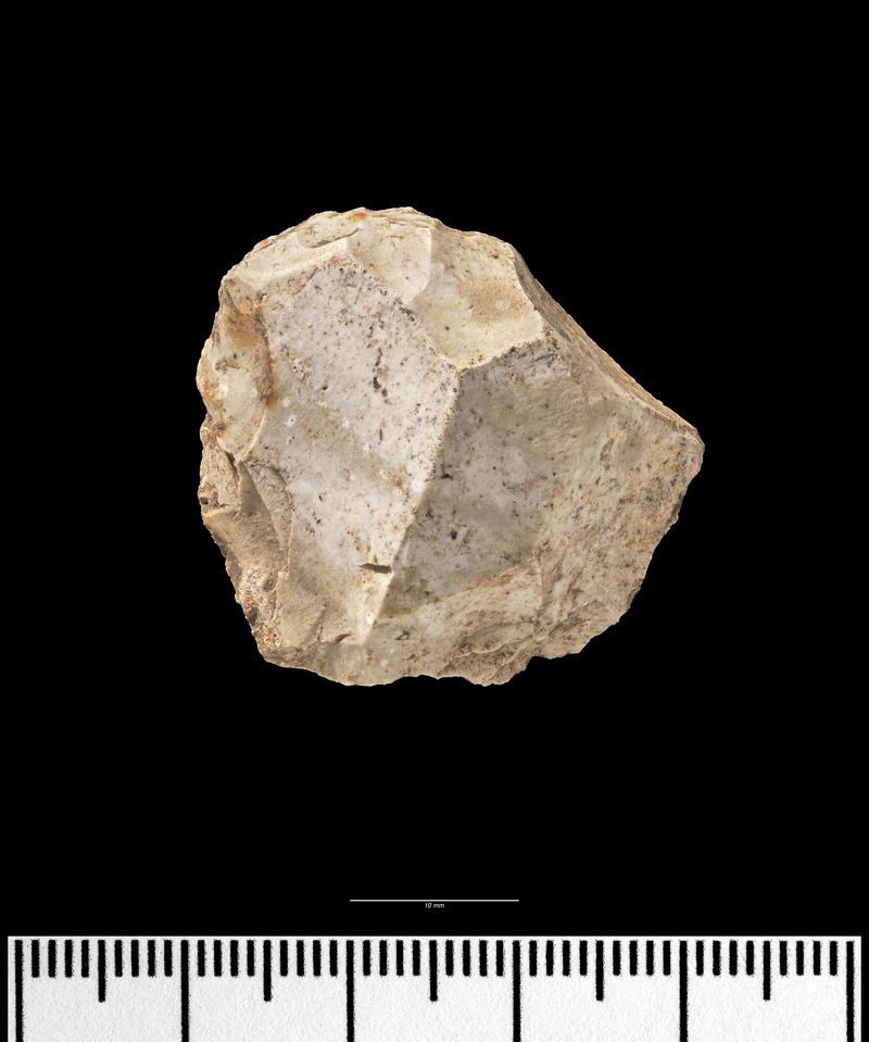 Fragment of side plate from a bone comb with partial rivet hole and small irreguar cut marks along one side where teeth would have been. Distorted and discoloured the result of fire.