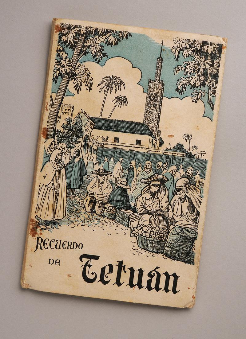 Book of postcards from Tangier, Morocco (Tanger in French); 12 sepia postcards showing various scenes, with perforated edges to detach from book; cover of book decorated with an illustration of a camel in a desert setting.