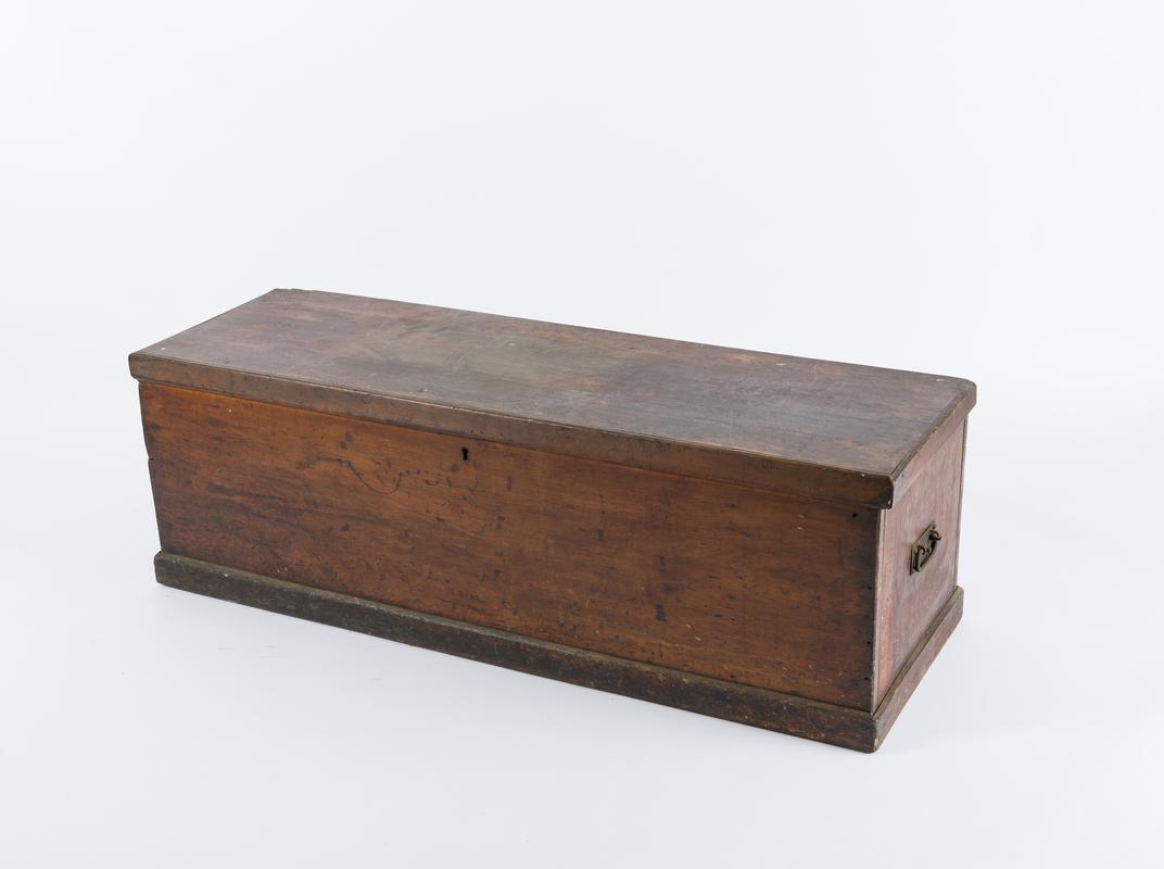 Rectangular tea caddy with tight fitting lid and octagonal sided knob; printed with gold background and all over floral and foliage pattern.