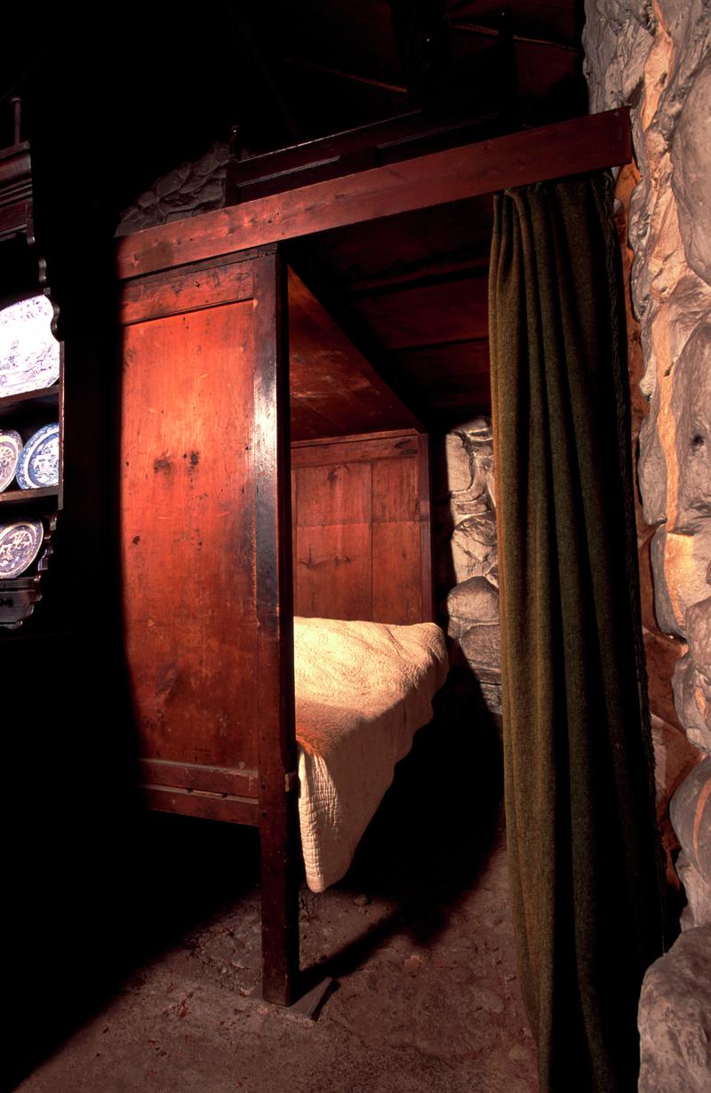 Enclosed bed (variously described as Bavarian or Austrian bed) with shaped, decorated head and foot boards with scroll motifs, turned finials and shaped posts, shaped side pieces which enclose a spring bed; on turned feet which are part of 4 main posts.