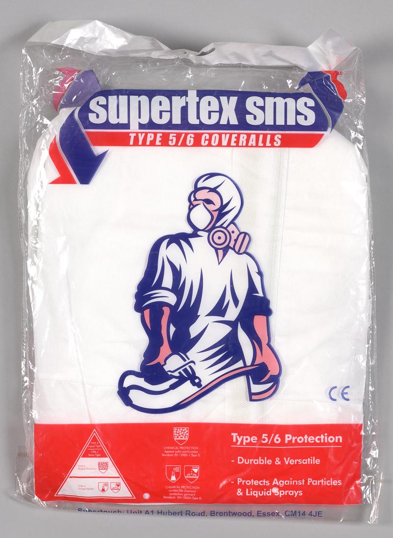 Scrub bag hand made by repurposing an old pillow case. Made from printed cotton/synthetic fabric blend. Pattern printed in grey and different shades of red. Pattern consists of horizonal stripes of different width: each with a different pattern. The open end of the pillow case has been folded over to the front in order to create a channel through which two strips of purple synthetic jersey fabric have been inserted for use of a draw-string. A gap has been created at either side to access the string for pulling. The ends of the string are knotted with a knot at either side of the bag's opening. A flap of material remains on the inside of the bag, which stems from the original construction of the pillow slip. On the opposite side, along the edge of the opening, the selvage of the fabric can be seen. Stitches original to the pillow case's construction are machine stitched using pale red thread, whereas machine stitches used to make the pillow case into a bag use white thread. The pillow case's original side seams are finished with overlocker stitches using white thread. Original printed care label remains attached to inner side seam. Length of white cotton string is knotted around the draw string on one side.