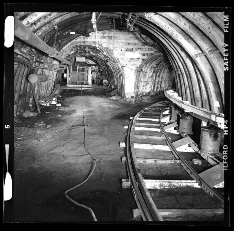 Black and white film negative showing pit bottom at Celynen North Colliery.