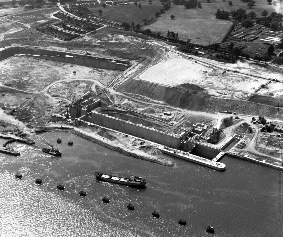 Aerial view of Atlantic Shipbuilding Co. (Bailey's Atlantic Ship Repairs), Newport with lake boat MANICO JAGAN.