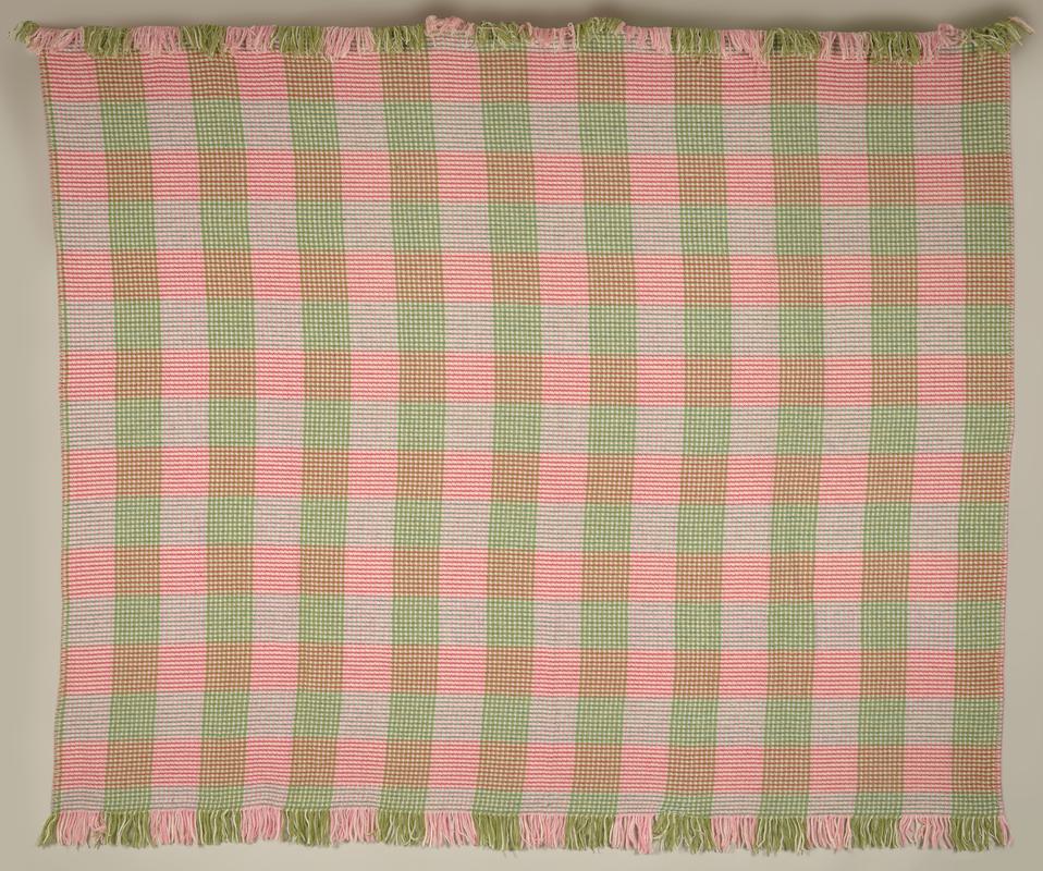 Red, blue, cream, light brown and grey plaid blanket. Whole cloth, side selvedges, ends turned by 15mm and machine blanket stitched.