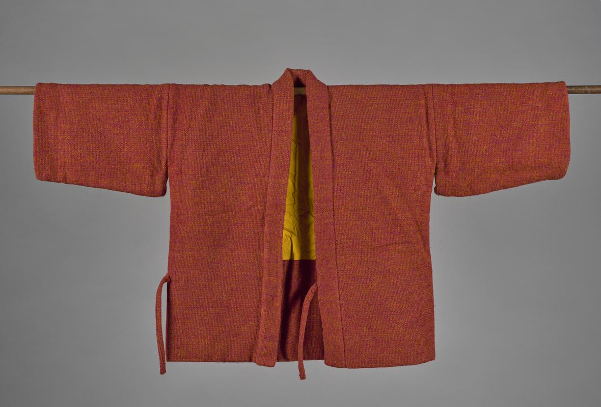 Child's hooded, lined anorak, 1970s-80s. Navy with turquoise lining to hood, body and sleeves. Knitted sleeve cuff. Hood elasticated. Two set-in zipped pockets. Full length zip fastening. Trimmed at hem and front edges with blue and turquoise floral woven braid. Dawstring at hem. Label with washing instructions, and card shop label attached. Unsold stock from A. Wood & Son, Blaenclydach.