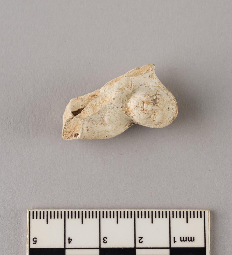 Figurine of Venus, face only. Split off flat at the back where the two separately-moulded halves of the figurine were formerly joined. There is a deep finger mark behind the features.
