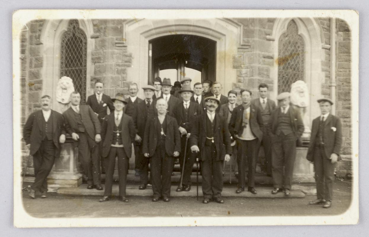 Group of men at Talygarn Convalescent Home for Miners. Watkin Carey, former lodge secretary Maclaren Colliery, Abertysswg, is seated on the left.