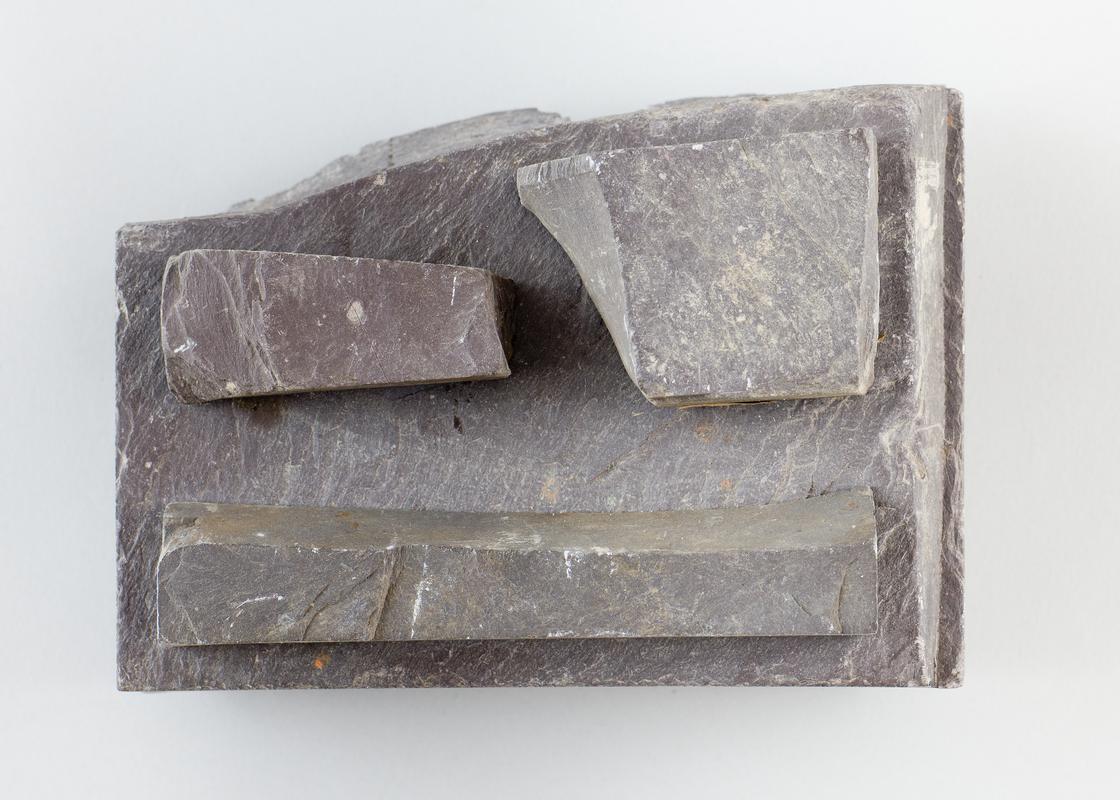 Patterned slate shape mounted on to slate. The slate was collected by the artist Sir Kyffin Williams over the years. The slate would then be glued together forming slate sculptures (a total of eleven). The sculpture were on display at the artist's home in Pwllfanogl.