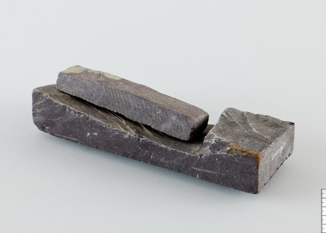 Patterned slate shape mounted on to slate. The slate was collected by the artist Sir Kyffin Williams over the years. The slate would then be glued together forming slate sculptures (a total of eleven). The sculpture were on display at the artist's home in Pwllfanogl.