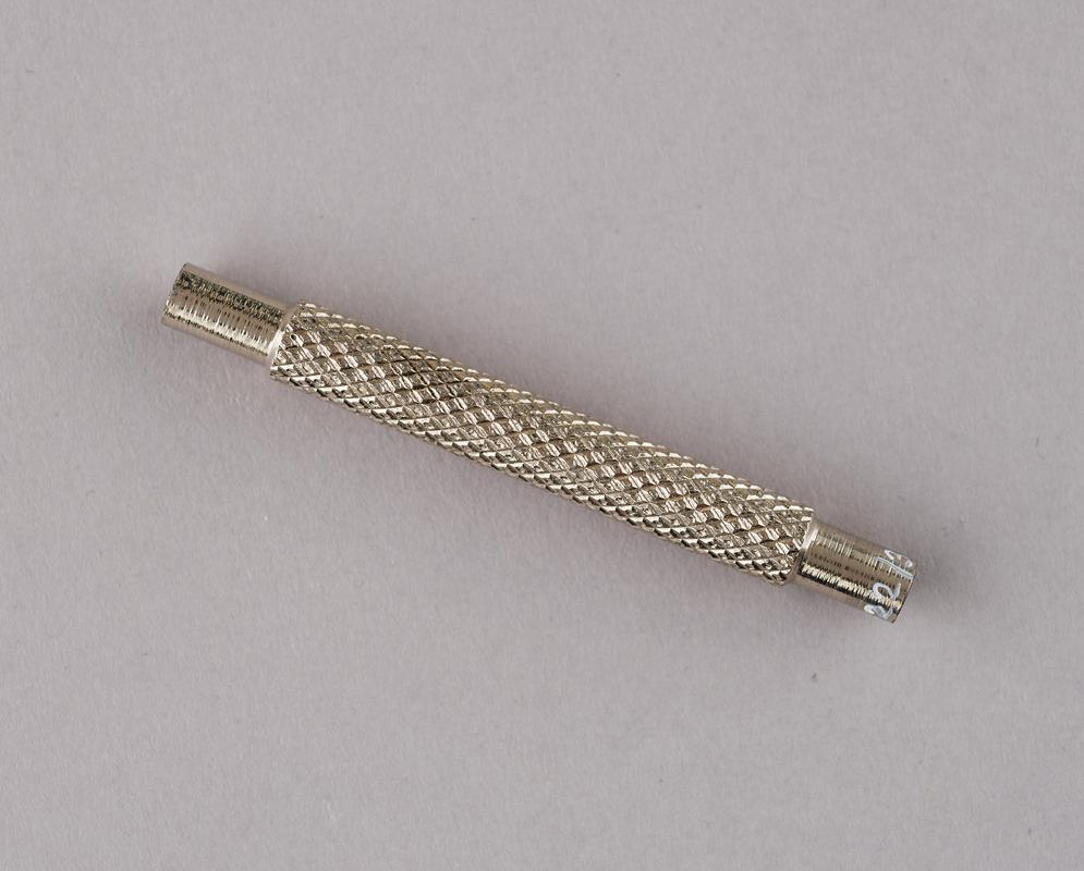Original wedge missing, a rail spike has been used instead. Hole in haft for tool bar.