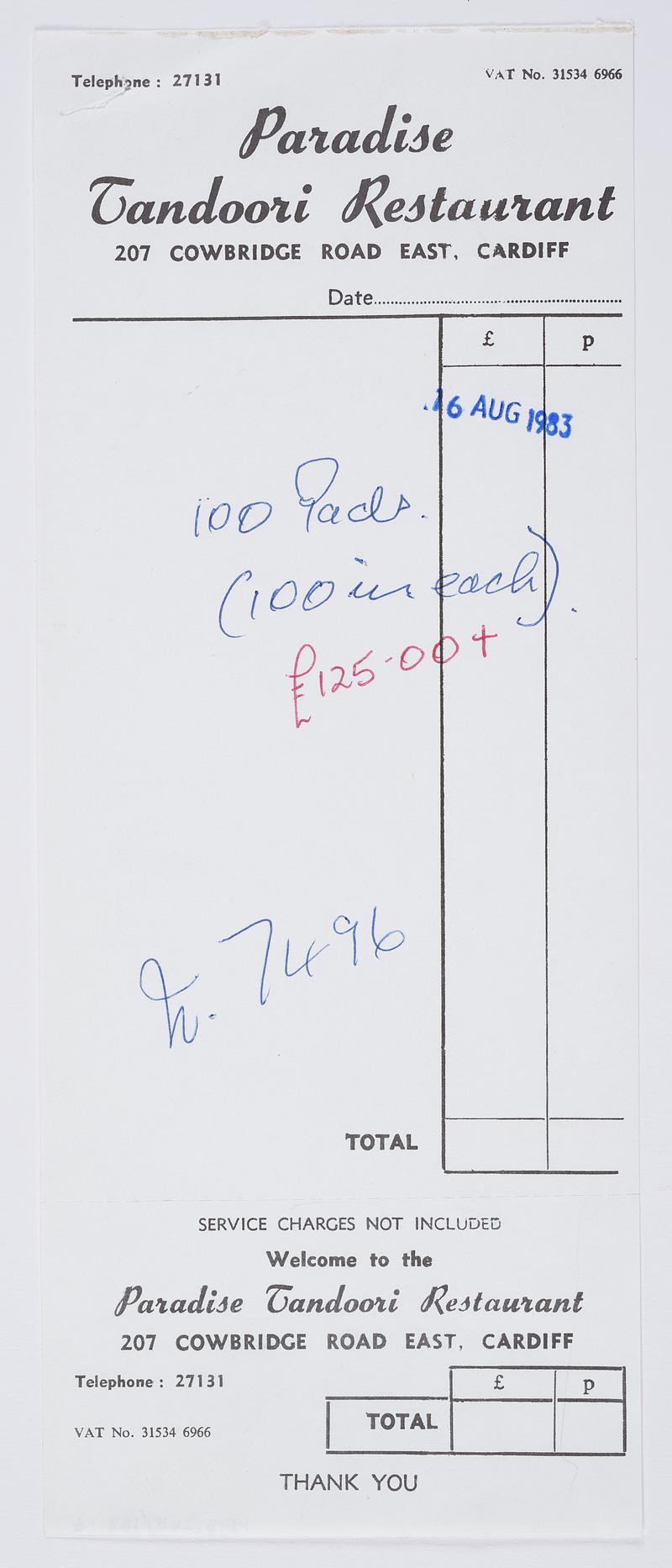 Menu printed for 'Kwong Fai' Chinese takeaway, Rumney, Cardiff. Handwritten order details on the front. Stamped with date 28 September 1986.