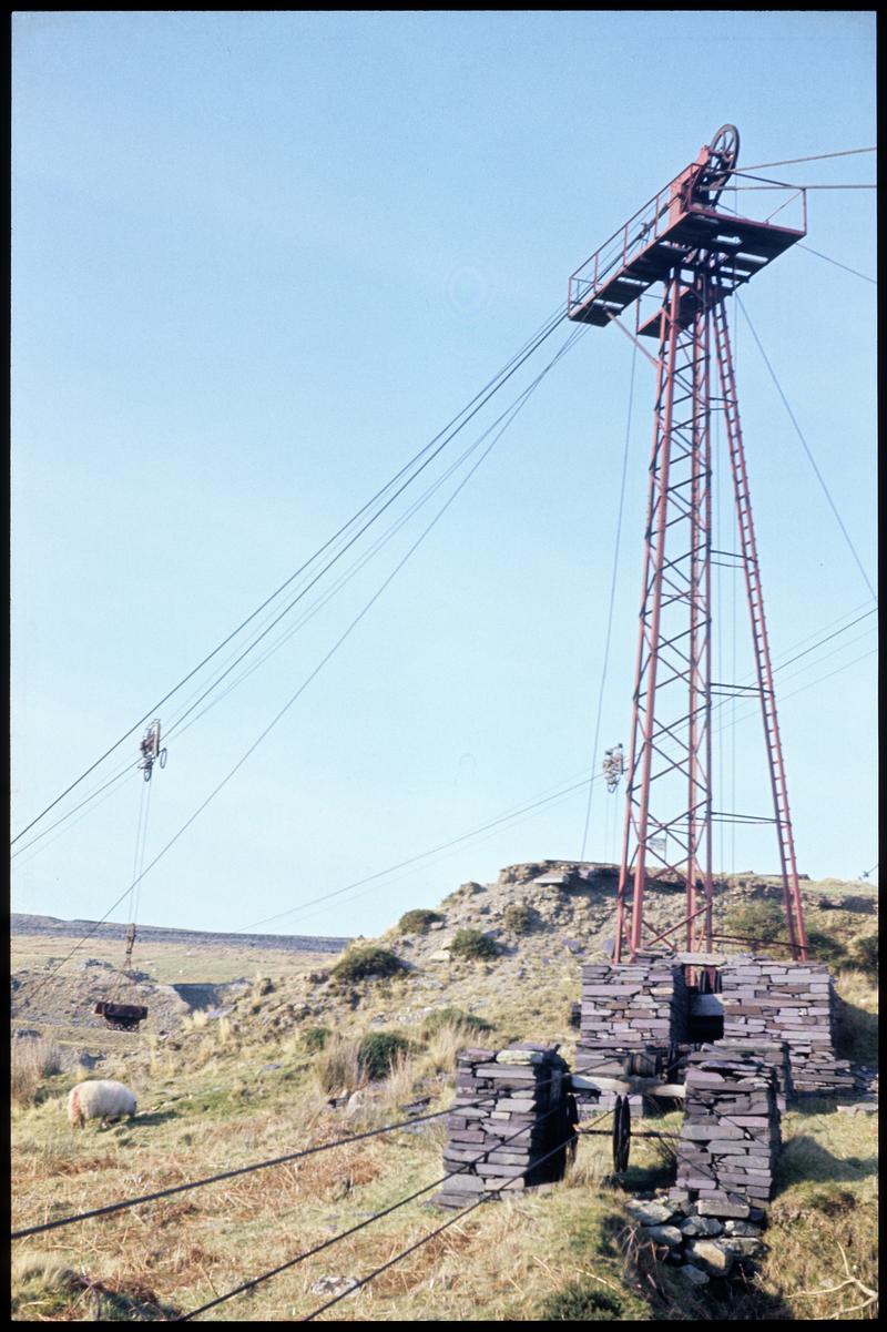 Colour slide showing Penyrorsedd, trucks by quarry 1970s.