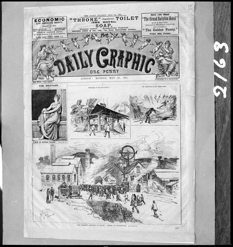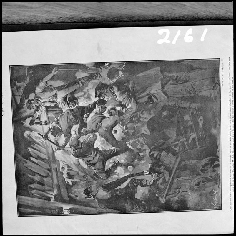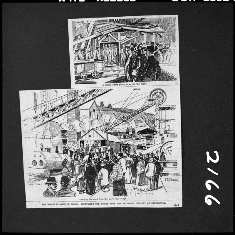 Black and white film negative showing the scene at Universal Colliery Senghenydd after the explosion of May 24th 1901, photographed from a publication. 'Senghenydd 1st disaster 1901' is transcribed from original negative bag.