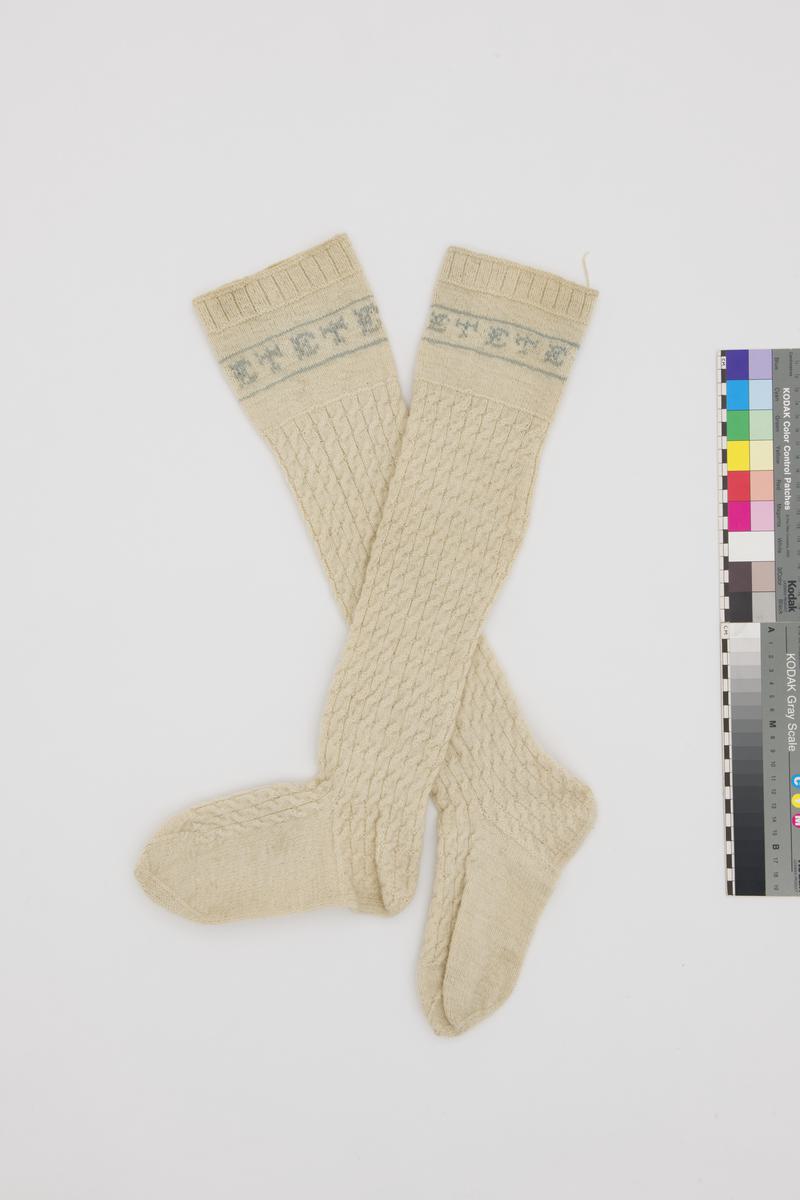 Pair of knitted stockings made in 1967 by Mrs H.O. Puls. Blue wool knitted in chevron pattern. Copied from a pair of stockings in the collection (45.338).