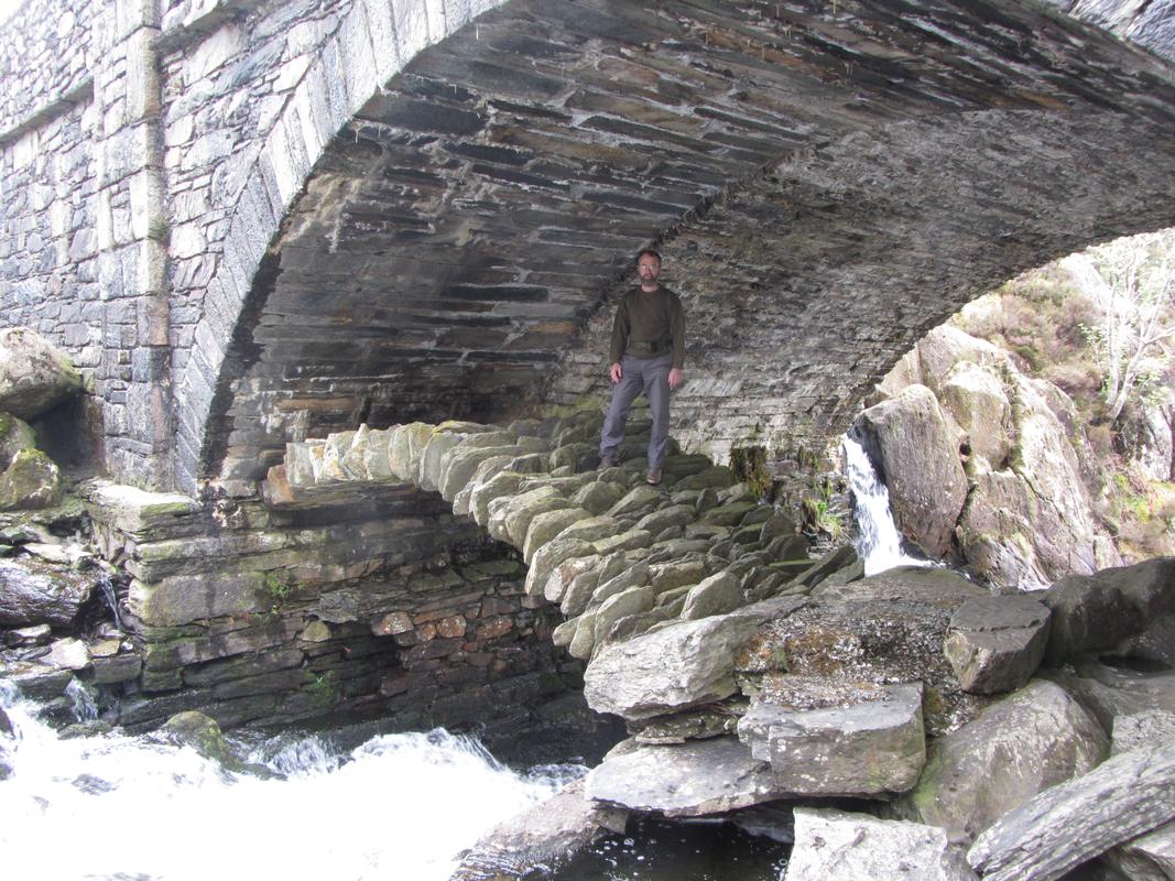 Pont Pen-y-benglog over Afon Ogwen (SH 604 / 648; 100m NW of Idwal Cottage / 10m E of Rhaeadr Ogwen), showing the remains of the original bridge, built as part of Telford’s Holyhead Road and now situated beneath the later larger bridge on a higher and easier alignment; viewed from the north east. The straight join visible in the underside of the arch of the later bridge shows that the west half was built considerably earlier than the east half.