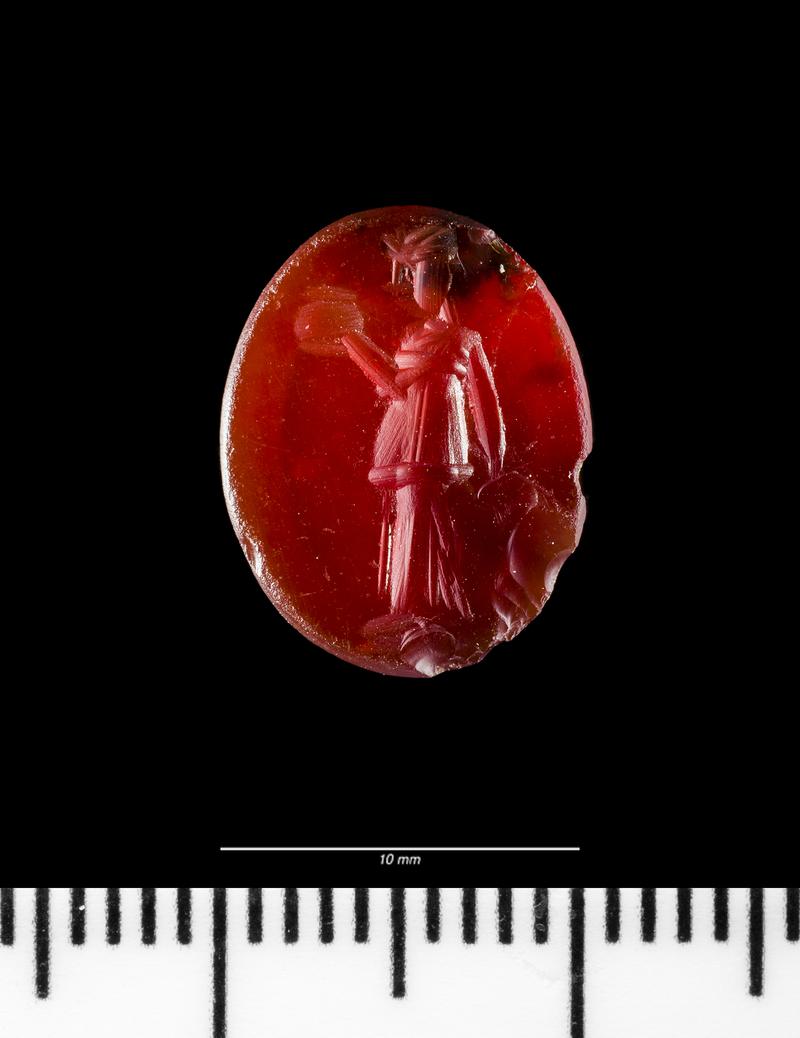 This is one of 88 engraved gemstones retrieved in 1979, mostly from the filling of a large drain beneath the cold hall of the fortress baths. The gemstones would originally have been set in finger-rings, and served as signets and charms or talismans for their owners. They were products of extremely skilled craftsman who worked on a minute scale without the aid of magnification. The gems are engraved with a wide range of deities, personification and symbols.