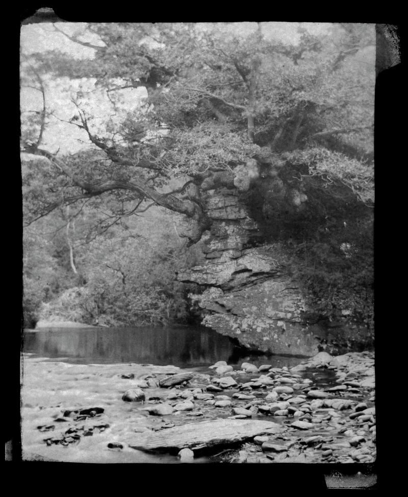 Collodion glass negative showing a stuffed duck in woodland setting.